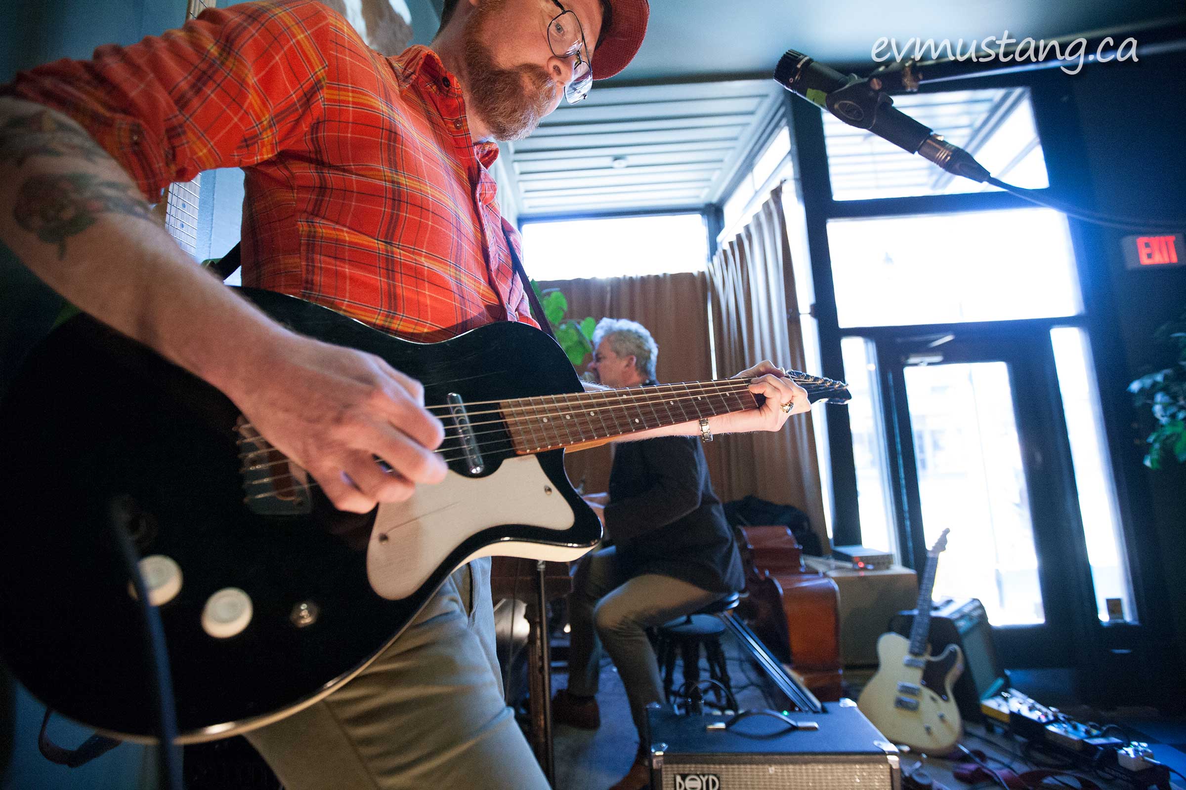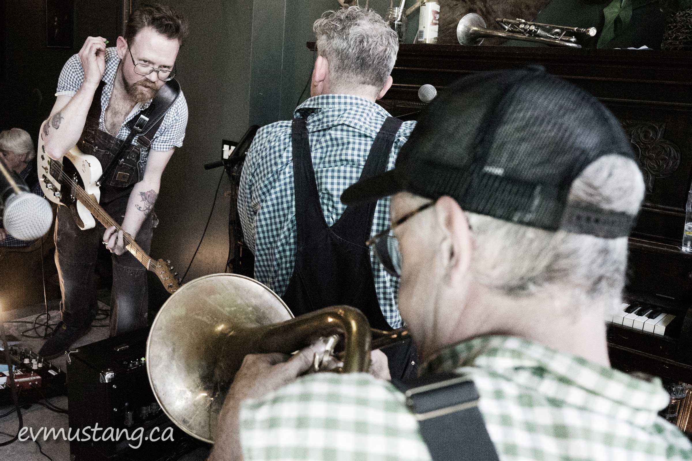 photograph of the Nihilist Spasm Band at the 50th anniversary opening of the Forest City Gallery in London, Ontario. Left to right" Bill Exley, John Clement, Murray Favro, Art Pratten. They are playing home made instruments. Behind them the gallery walls show the work from the exhibition Towards Braiding: Dreaming of Anti-colonial Futures in the Forest City